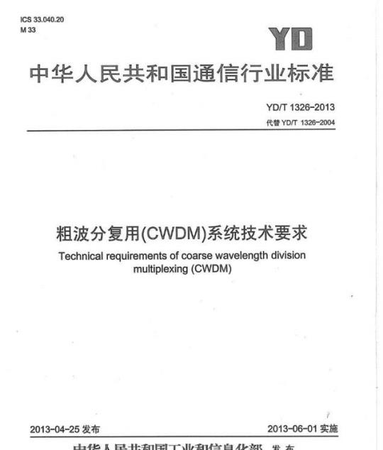 YD/T 1326规定了波长间隔为20m的等通路间隔、通路数目多达8波、通路速率高达10G的粗波分复用系统的技术要求,包括光波长区的分配、光接口分类、参数定义及参数值、监控通路、网络管理和系统保护等。