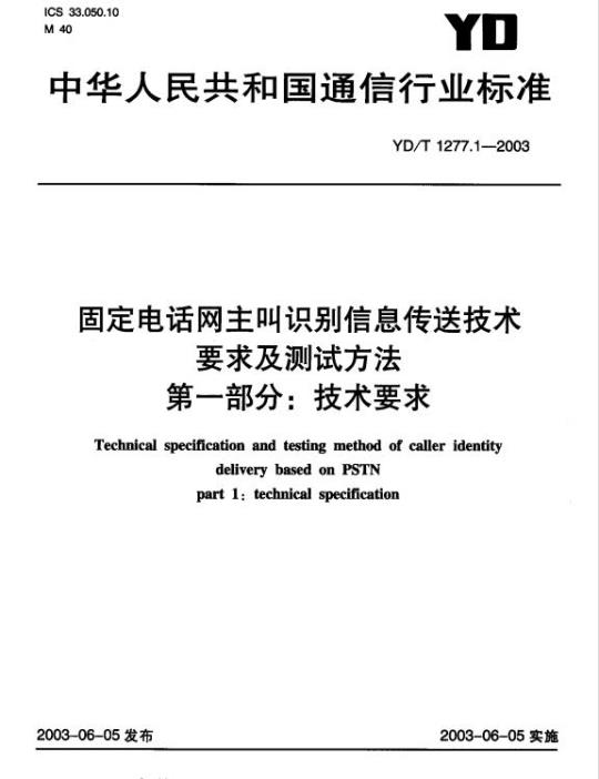 YD/T 1277.1规定了本地交换机(LS) 和用户终端设备(CPE) 之间的传送协议,以及LS和CPE在适应主叫识别信息传送业务方面的技术要求。
