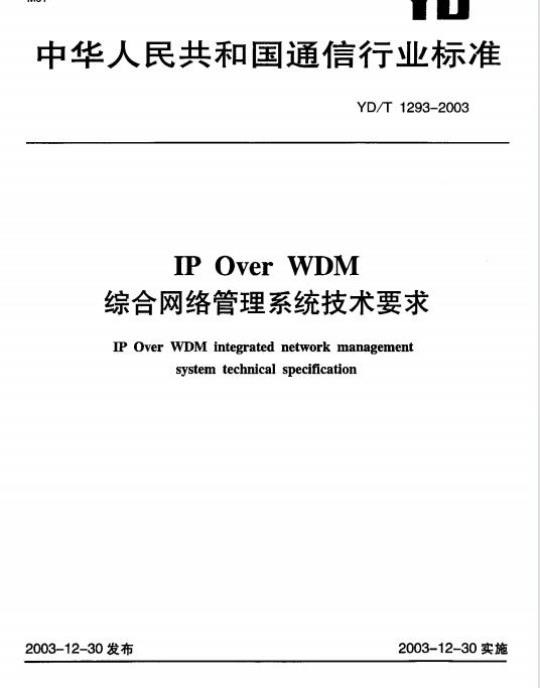 YD/T 1293规定了IPOverWDM综合网络管理系统的系统功能需求;规定了IPOverWDM综合管理系统分别与IP网管系统及WDM网管系统之间的接口功能需求及接口信息模型。