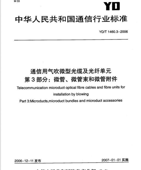 YD/T 1460的YD/T 1460.3规定了微管和微管束的定义、产品型号和标记、要求、试验方法、检验规则、包装、运输和贮存及微管附件的基本要求。