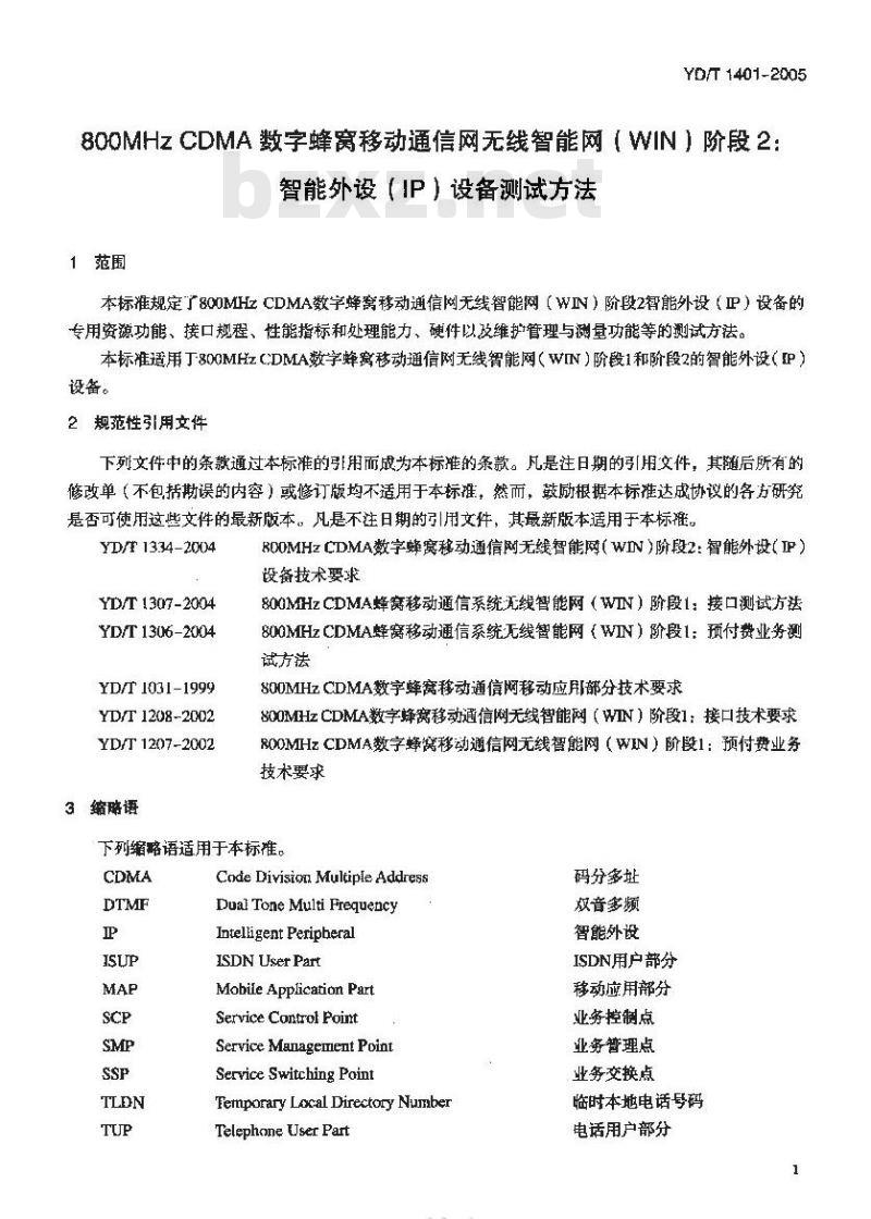 YD/T 1401适用于800MHz CDMA数字蜂窝移动通信网无线智能网(WIN)阶段1和阶段2的智能外设(IP)设备。