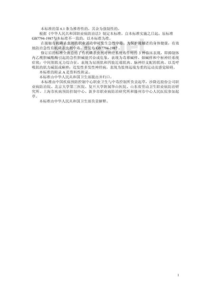 本标准的第6.1条为推荐性的,其余为强制性的。根据《中华人民共和国职业病防治法》制定本标准。自本标准实施之日起,原标准GB7794-1987与本标准不一致的,以本标准为准。在接触有机磷杀虫剂的职业活动中可发生急性中毒。为保护接触者的身体健康,有效地防治急性有机磷杀虫剂中毒,曾发布GB7794-1987修订后的标准全面总结了有机磷杀虫剂对神经系统毒作用的3种临床表现,即抑制体内乙酰胆碱酯酶引起的急性胆碱能兴奋或危象,表现为毒草碱样、烟碱样和中枢神经系统症状;中间期肌无力综合征,表现为屈颈肌和四肢近端肌肉、脑神经支配的肌肉、以及呼吸肌的肌力减弱或麻痹;迟发性多发性神经病,表现为肢体远端为重的运动及感觉障碍。本标准的附录A是资料性附录。