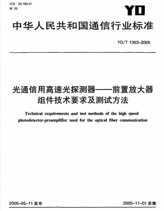 YD/T 1353-2005.Technical requirements and test methods of the high speed photodetector-preamplifier used for the optical fiber communication.