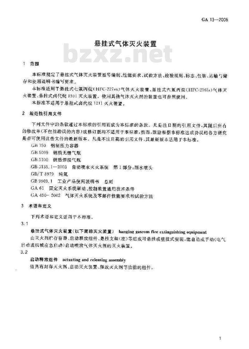 GA 13适用于悬挂式七氟丙烷(HFC-227ea)气体灭火装置、悬挂式六氟丙烷(HFC 236fa)气体灭火装置悬挂式卤代烷1301灭火装置。使用其他气体灭火剂的装置也可参照使用。