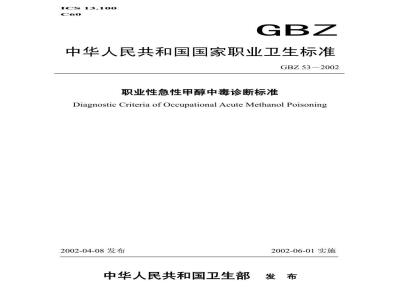 本标准规定了职业性急性甲醇中毒的诊断标准及处理原则。本标准适用于职业性急性甲醇中毒的诊断及处理。 GBZ 53-2002 职业性急性甲醇中毒诊断标准 GBZ53-2002 标准下载解压密码:www.bzxz.net