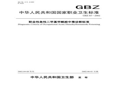 职业性急性二甲基甲酰胺中毒诊断标准Diagnostic Criteria of Occupational Acute Dimethylformamide Poisoning2002-04-08发布