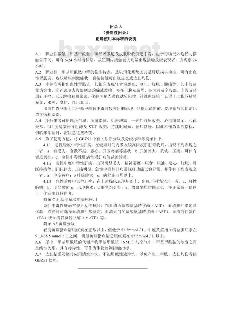 轻度黄指血清胆红素在正常以上,但低于51.3mmol/L:中度黄疤指血清总胆红素在51.3-85.5mmol/L之间,明显黄疽指血清总胆红素在85.5mmol/L以上。A.6尿中二甲基甲酰胺的代谢产物甲基甲酰胺(NMF)与空气中二甲基甲酰胺的浓度之间呈线性关系,具有特异性。可作为生物监测接触指标。A.7皮肤粘膜污染时应用清水冲洗,不能用碱性液冲洗,以免产生二甲胺。皮肤灼伤者按GBZ51处理。