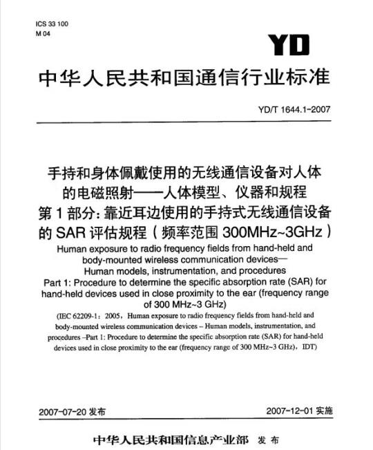 YD/T 1644.1规定了使用时发射部分靠近耳边使用的手持无线通信设备的比吸收率的评估规程。