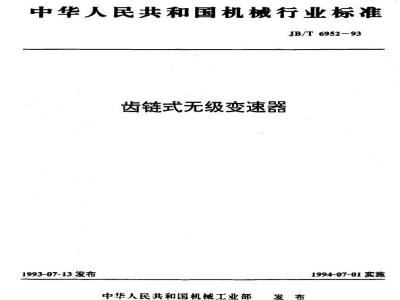 本标准规定了齿链无级变速器的型式、基本参数、技术要求、试验方法、检验规则、标志、包装、运输和贮存。本标准适用于调速比2.8~6,电机功率0.75~22kW,可以顺逆双向旋转,工作环境温度为-40~ 40℃,或环境温度低于0℃时,启动前润滑油需预热的齿链式无级变速器。 JB/T 6952-1993 齿链式无级变速器 JB/T6952-1993 标准下载解压密码:www.bzxz.net
