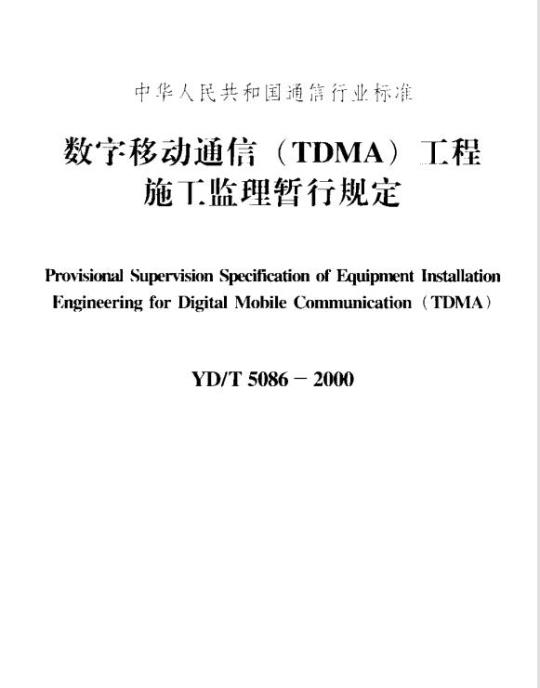 1.0.2YD/T 5086适用于新建移动通信(TDMA)工程施工监理。对于CDMA移动通信工程及改建、扩建的TDMA施工监理,可参照执行本暂行规定。