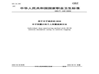 本标准推荐了用于中子测井场所的CR39 中子剂量计的个人剂量监测方法。本标准适用于241Am-Be中子源测井场所工作人员的个人中子剂量监测。 GBZ/T 148-2002 用于中子测井的CR39中子剂量计的个人剂量监测方法 GBZ/T148-2002 标准下载解压密码:www.bzxz.net