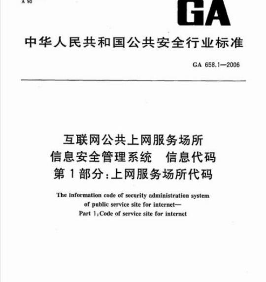 GA 658.1规定了互联网公共上网服务场所(以下简称上网服务场所)信息安全管理系统进行数据处理和交换时使用的上网服务场所代码。