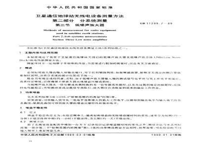 Methods of measurement for radio equipmentused in satellite earth stationsPart 2:Sub-systems measurenentsSection Three-Low noise amplifier本标准为《卫星通信地球站无线电设备测量方法》系列标准之一。1主题内容与适用范围