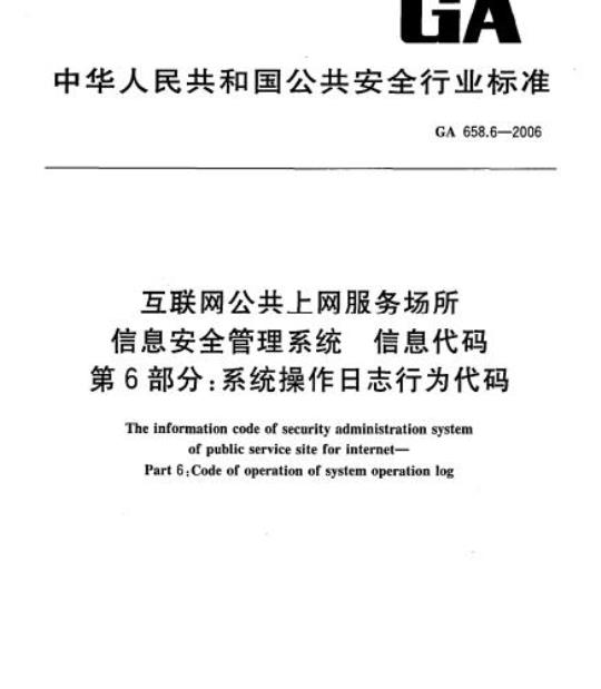 GA 658.6规定了互联网公共上网服务场所(以下简称上网服务场所)信息安全管理系统进行数据处理和交换时使用的系统操作日志行为代码