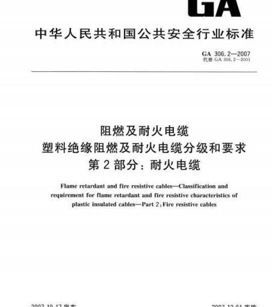 GA3062007《阻燃及耐火电缆塑料绝缘阻燃及耐火电缆分级和要求》分为两个部分:——第1部分:阻燃电缆;