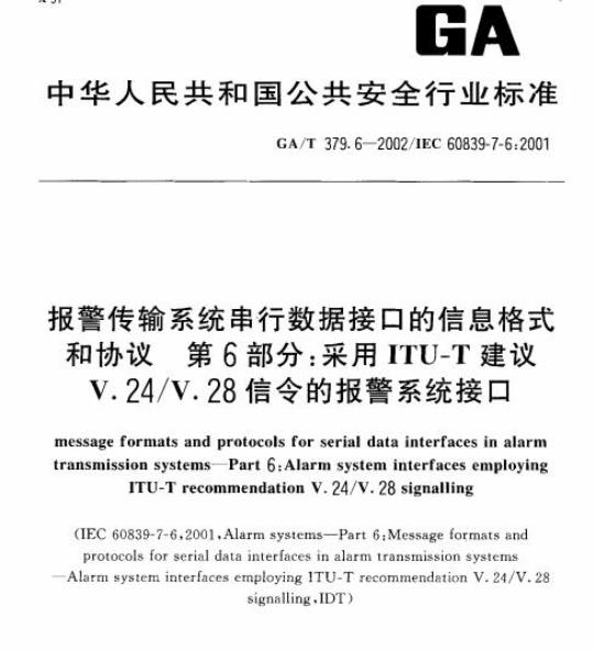 GA/T 379.6规定了报警系统中控制和指示设备和远程通信传输设备采用ITU-T建议V.24/V.28信令进行通信时的标准接口要求,其中通信传输设备是通用设备,并不是专为报整行业设计的(因此并不符合本标准的其他部分的要求)。