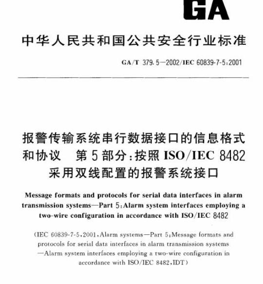 GA/T 379.5规定了按照ISO/IEC 8482采用双线连接的标准接口的要求。适用于报警系统控制和指示设备(CIE)与连接到报瞥传输系统的--个或多个报警系统收发器之间的标准接口。