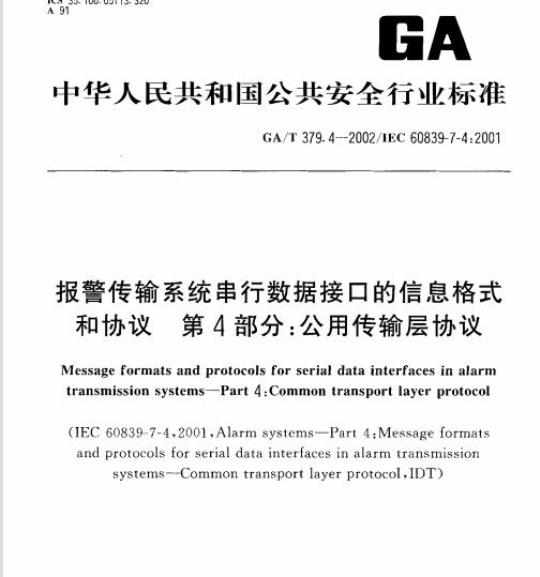 GA/T 379.4等同适应于报警信息的传输和发往/来自入侵、火警、出人口控制和社会报警系统的其他信息的传输,以及发往/来自其他类似系统的信息的传输。