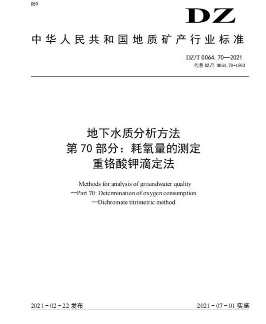 DZ/T 0064的DZ/T 0064.70规定了重铬酸钾滴定法测定地下水中耗氧量的方法。