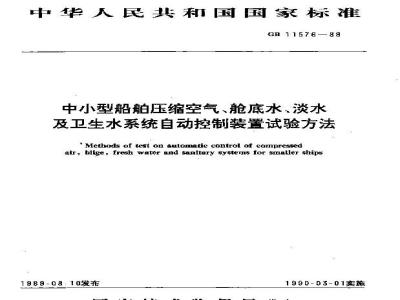 中小型船舶压缩空气、舱底水、淡水及卫生水系统自动控制装置试验方法' Methods of test on sutomatic control of comprcssedalr, bllge, fresh water and sanitary systems for smaller ships1989-08:10发布