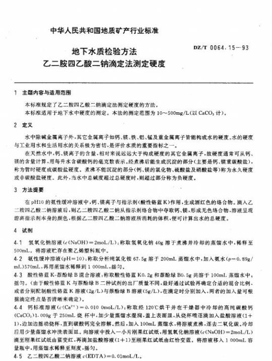 DZ/T 0064.15规定了乙二胺四乙酸二钠滴定法测定硬度的方法。