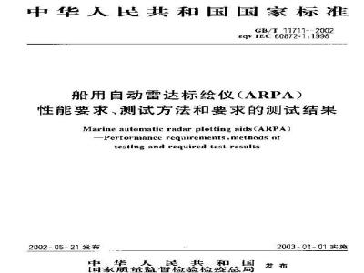 本标准举效采用[EC60872-1.自动需达标缺议(ARPA)测试方送和要求的测试结果1995年IVI0国际海事组织)在其1V大会上通过决议A.323(15),修订了1M0决议A.422().199%年TEC发市了1FCj0872-1.FC:6C872-1是1FC60872标准乘列的第一部分。该系列标雅取代1987年岁布的1ECS0372标满村将正索1(1991)6C72-1全面安映1M0设A,523提出的ARPA性能标准的新要求,规定了均比性能要求的测试方运和要求达到的测试结果,适合我国采纳为层家标准·用于指导我国4R卫A设备的科研、生产和管理,并使下与国尿接。本标准方IFC60872-1的害要差分如下弃第1卒“范用”中,增加「“标准适用于ARA的设升,使用,性能评古和型式试按“的说明;