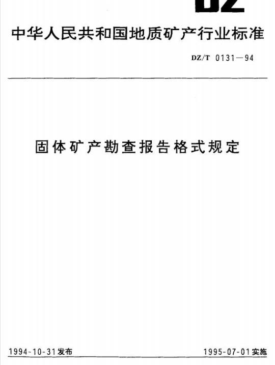 DZ/T 0131规定了固体矿产勘查报告的标准格式,报告形式构成,组成技术文件分类;报告正文、附图、附表、附件的格式内容;报告的编辑、制印版式和制印质量要求。