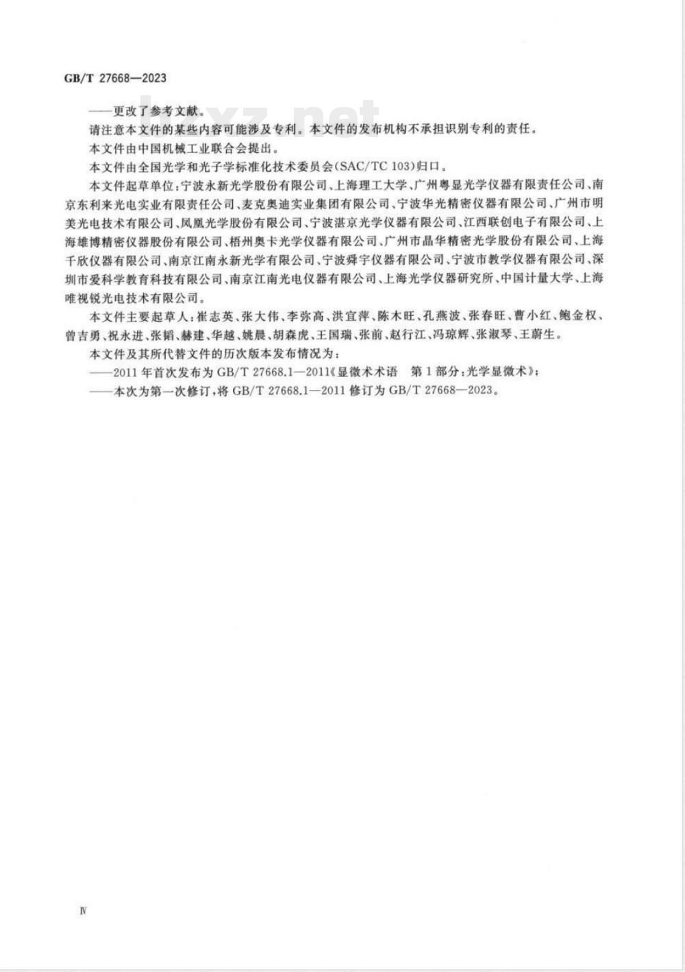 本文件主要起草人:崔志英、张大伟、李弥高、洪宜萍、陈木旺、孔燕波、张春旺、曹小红、鲍金权、曾吉勇、祝永进、张韬、赫建、华越、姚晨、胡森虎、王国瑞、张前、赵行江、冯琼辉、张淑琴、王蔚生。本文件及其所代替文件的历次版本发布情况为:-2011年首次发布为GB/T27668.1—2011《显微术术语第1部分:光学显微术》:
