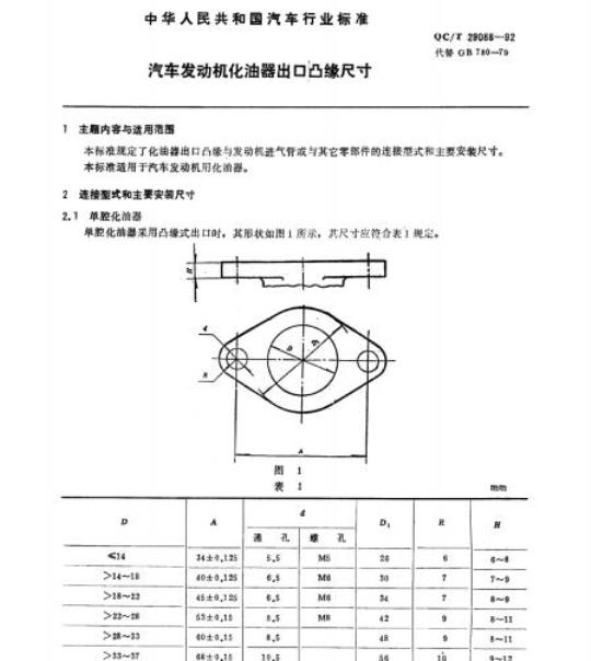 QC/T 29088规定了化油器出口凸缘与发动机进气管或与其它零部件的连接型式和主要安装尺寸。