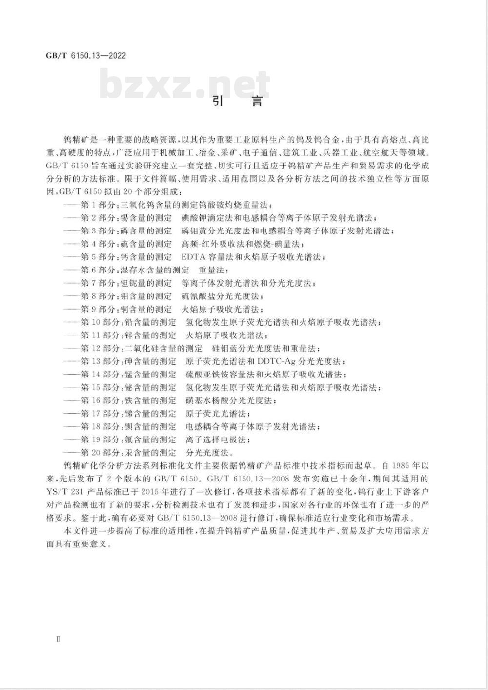 增加了“试验报告”一章(见第6章)。请注意本文件的某些内容可能涉及专利。本文件的发布机构不承担识别专利的责任。本文件由中国有色金属工业协会提出。本文件由全国有色金属标准化技术委员会(SAC/TC243)归口。本文件起草单位:赣州有色冶金研究所有限公司、湖南柿竹园有色金属有限责任公司郴州钨制品分公司、金堆城钼业股份有限公司、湖南柿竹园有色金属有限责任公司、江西省钨与稀土产品质量监督检验中心、赣州华兴钨制品有限公司、国标(北京)检验认证有限公司、长沙矿冶研究院有限责任公司。本文件主要起草人:赖剑、陈涛、张文星、黎英、侯贵琼、苏雄、张碧兰、刘鸿、钟莹、吕平、田新、杨炳红、王长基、张元霞、郭玉、郭辉。本文件及其所代替文件的历次版本发布情况为:1985年首次发布为GB6150.15-1985;-2008年第一次修订为GB/T6150.13—2008;一本次为第二次修订。