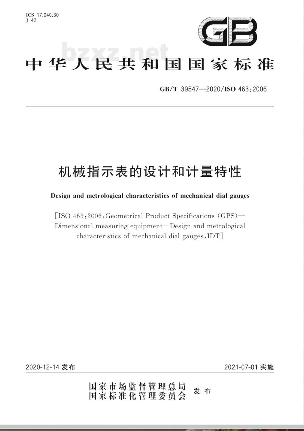 本标准按照GB/T1.1—2009给出的规则起草GB/T39547—2020/ISO463:2006本标准使用翻译法等同采用ISO463:2006《产品几何量技术规范(GPS)长度测量器具机械指示表的设计和计量特性》。
