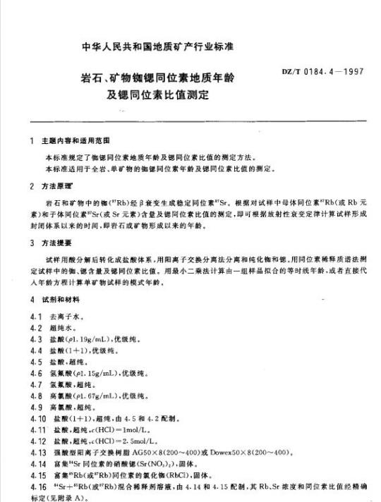 DZ/T 0184.4规定了铷锶同位素地质年龄及锶同位素比值的测定方法。