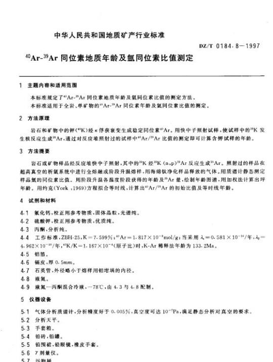 本标准魏定了\A-\Ar同款地资年龄及益向处索比值的测定方偿,DZ/T 0184.8-:997