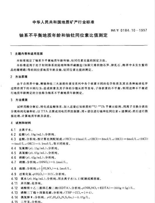 DZ/T 0184.10规定了铀系不平衡地质年龄和铀、钍同位素比值的测定方法。