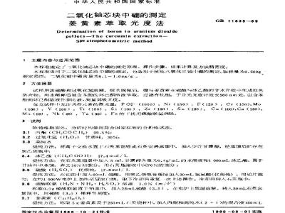 本标准规定了二氧化心块中硼的测定原理、操伪步骤、结果计算及方法精密度。本标准适用于二氧化芯块中硼的测定,也适用于核纯八氧化三硼的测定。取样量为0.500g。测定范封:一氧化铀牛硼含量为0.1~1.0鸣/g2方法提雾