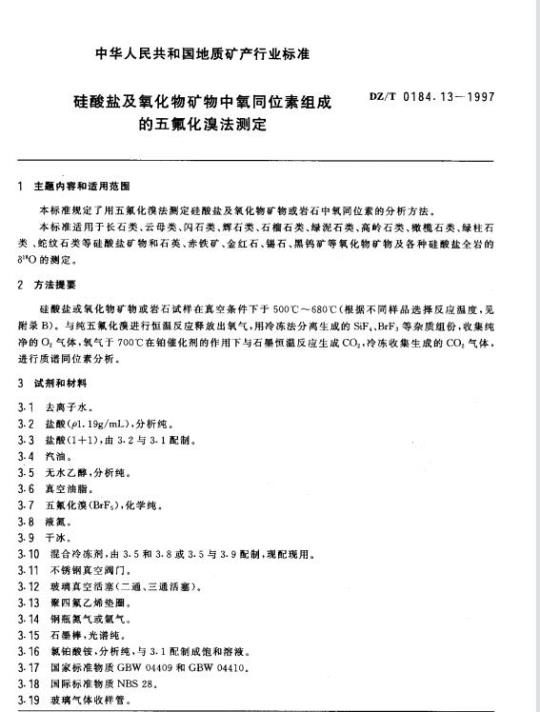 DZ/T 0184.13规定了用五氟化溴法测定硅酸盐及氧化物矿物或岩石中氧同位素的分析方法。