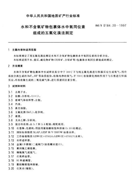 DZ/T 0184.20规定了用五氟化溴法测定水和不含氡矿物包裹体水中氧同位素的分析方法。