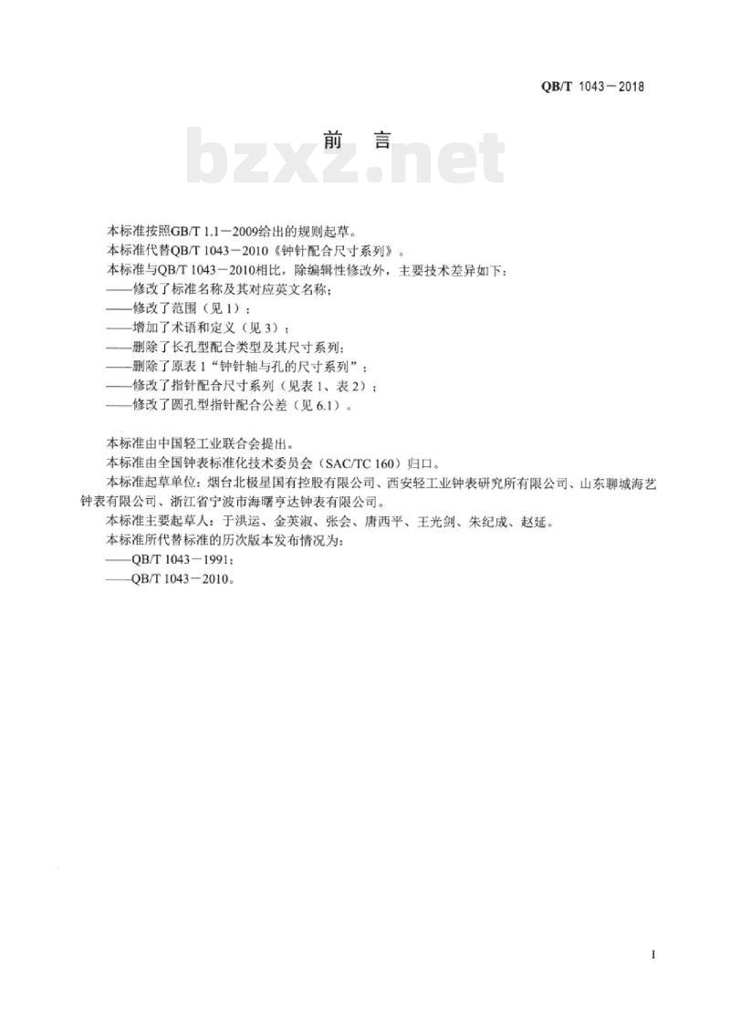 删除了长孔型配合类型及其尺寸系列:-删除了原表1“钟针轴与孔的尺寸系列”;修改了指针配合尺寸系列(见表1、表2):修改了圆孔型指针配合公差(见6.1)。本标准由中国轻工业联合会提出。本标准由全国钟表标准化技术委员会(SAC/TC160)归口。QB/T1043-2018
