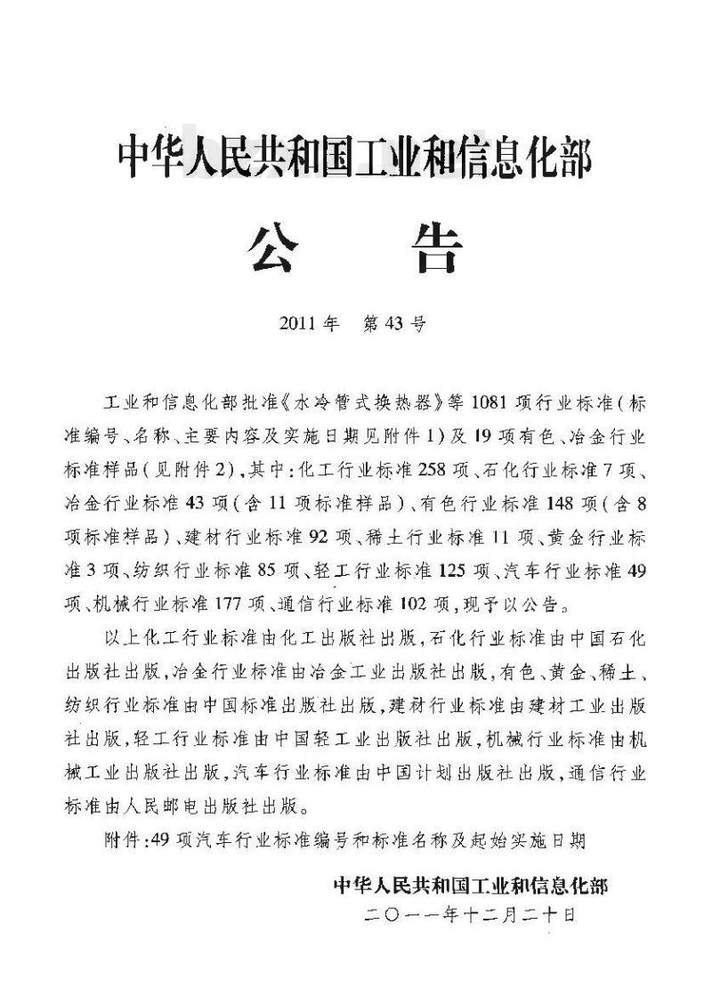 工业和信息化部批准《水冷管式换热器》等1081项行业标准(标准编号、名称、主要内容及实施日期见附件1)及19项有色、冶金行业标准样品(见附件2),其中:化工行业标准258项、石化行业标准7项、冶金行业标准43项(含11项标准样品)、有色行业标准148项(含8项标准祥品)、建材行业标准92项、稀土行业标准11项、黄金行业标准3项,纺织行业标准85项、轻工行业标准125项、汽车行业标准49项、机械行业标准177项、通信行业标准102项,现予以公告。以上化工行业标准由化工出版社出版,石化行业标准由中国石化出版社出版,冶金行业标准由冶金工业出版社出版,有色、黄金、稀土、纺织行业标准由中国标准出版社出版,建材行业标准由建材工业出版社出版,轻工行业标准由中国轻工业出版社出版,机械行业标准由机械工业出版社出版,汽车行业标准由中国计划出版社出版,通信行业标准由人民邮电出版社出版。