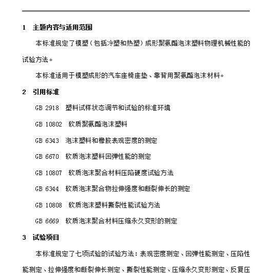 QC/T 56规定了模塑(包括冷塑和热塑)成形聚氨酯泡沫塑料物理机械性能的试验方法。