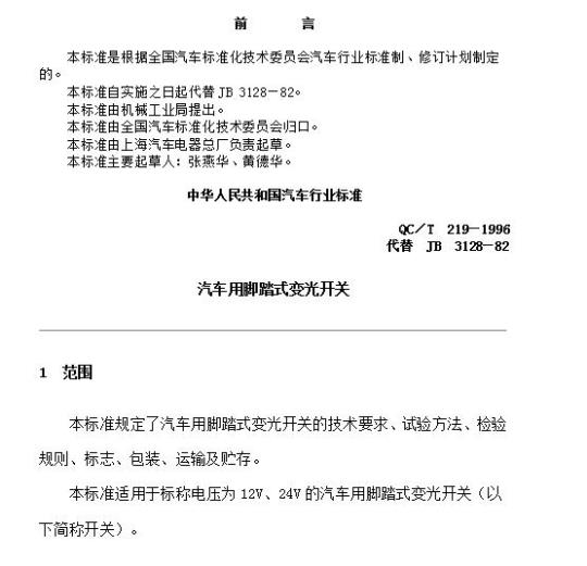 QC/T 219适用于标称电压为12V、24V的汽车用脚踏式变光开关(以下简称开关)。
