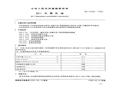 本标准规定了乐果乳油的技术要求、试验方法、检验规则以及标志、包装、运输和贮存的要求。本标准适用于由乐果原药与乳化剂溶解在适宜的溶剂中配制成的乳油。 GB 15583-1995 40%乐果乳油 GB15583-1995 标准下载解压密码:www.bzxz.net