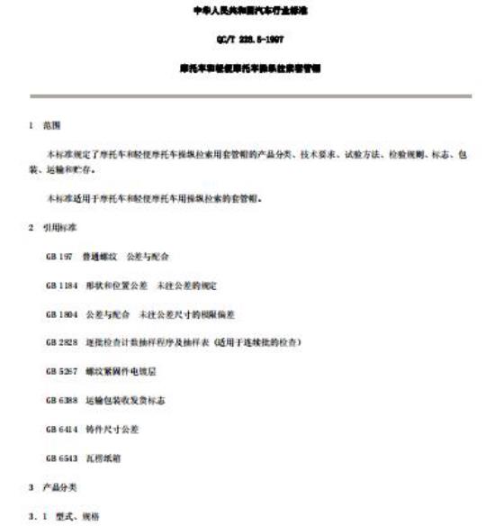 QC/T 228.5规定了摩托车和轻便摩托车操纵拉索用套管帽的产品分类、技术要求、试验方法、检验规则、标志、包装、运输和贮存。