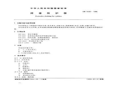 本标催规定了焊接防护服的分类、技术要求、试验方法、检验规则、标志、包装、运输与贮存。本标准适用干以织物,皮革或通过贴膜或喷涂制成的织物为面料,用缝制工艺制作的焊接防护服。