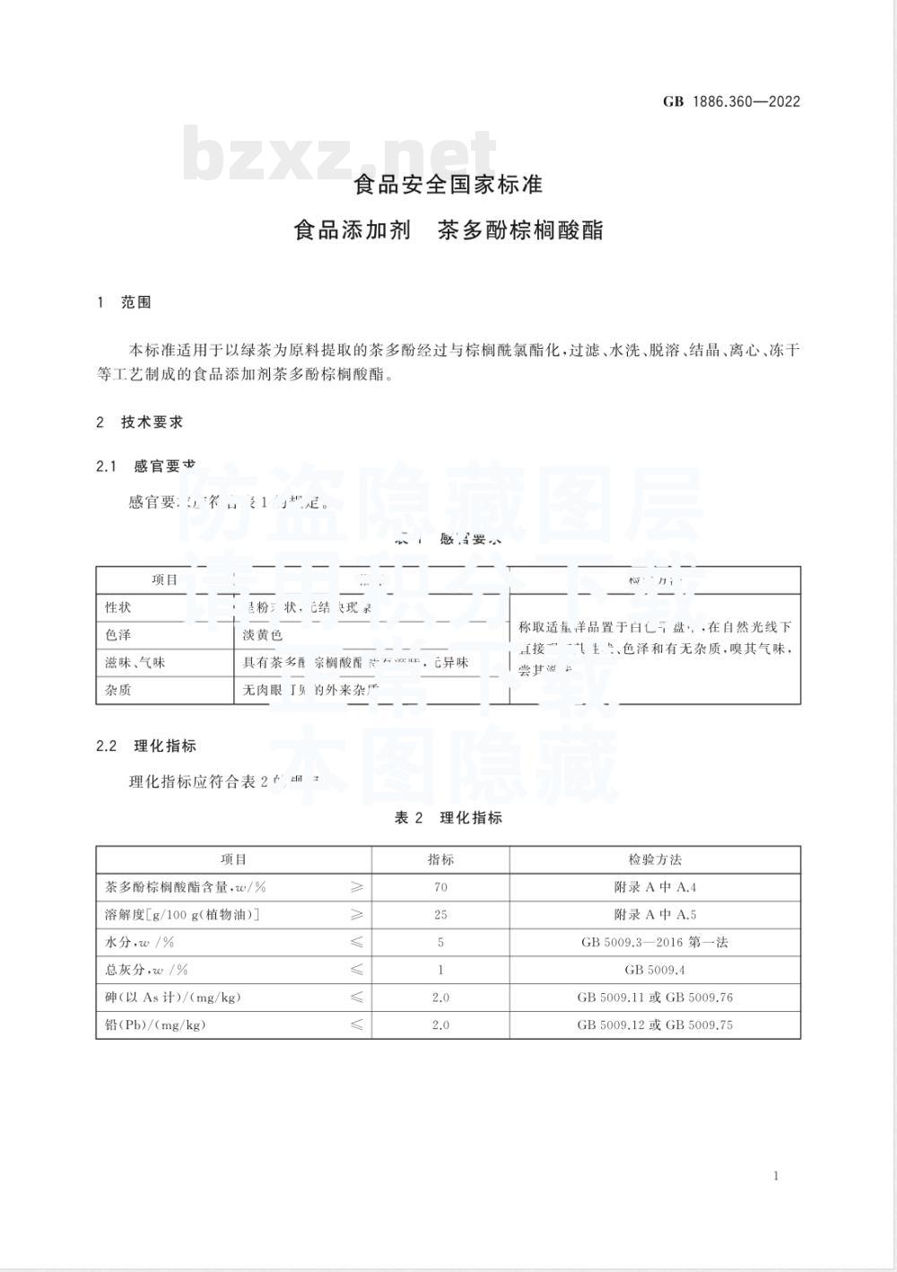 本标准适用于以绿茶为原料提取的茶多酚经过与棕榈酰氯酯化,过滤、水洗、脱溶、结晶、离心、冻于等工艺制成的食品添加剂茶多酚棕榈酸酯2
