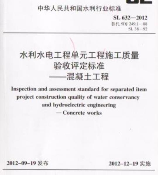 SL 632-2012.Inspection and assessment standard for separated item project construction quality of water conservancy and hydroelectric enginering-Concrete works.