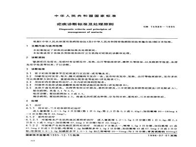 本标准规定了疟疾的诊断标准及处理原则。本标准适用于各级各类防疫和医疗卫生机构对疟疾的诊断和处理。 GB 15989-1995 疟疾诊断标准及处理原则 GB15989-1995 标准下载解压密码:www.bzxz.net