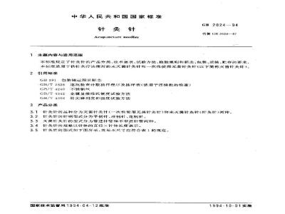 本标准规定了针灸针的产品分类、技术要求、试验方法、检验规则和标志、包装、运输、贮存的要求。本标准适用于供针灸疗法使用的未灭菌针灸针和一次性使用无菌针灸针。 GB 2024-1994 针灸针 GB2024-1994 标准下载解压密码:www.bzxz.net
