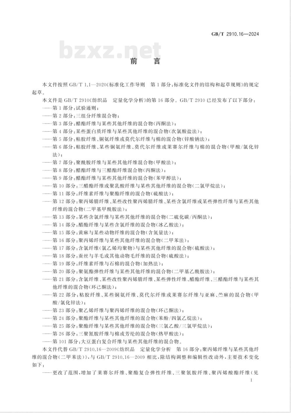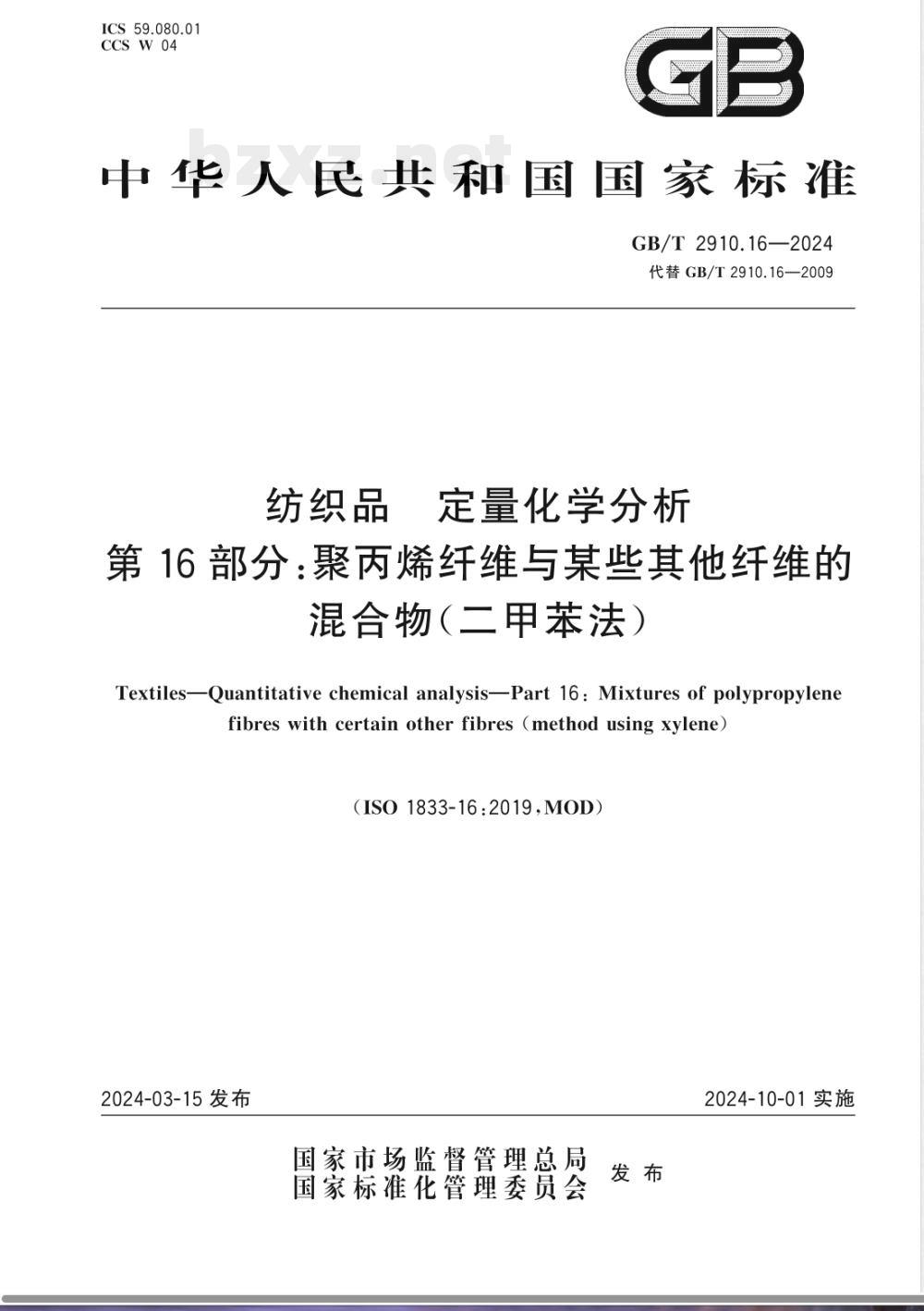 一增加了新增纤维的d值(见第8章);精密度中的置信界限由“不超过士1”更改为“不超过士1%”(见第9章,2009年版的第8章)。本文件修改采用ISO1833-16:2019《纺织品定量化学分析第16部分:聚丙烯纤维与某些其他纤维的混合物(二甲苯法)》。本文件与ISO1833-16:2019的技术差异及其原因如下:用规范性引用的GB/T2910.1替换了ISO1833-1(见第5章~第8章),以便标准使用。请注意本文件的某些内容可能涉及专利。本文件的发布机构不承担识别专利的责任。本文件由中国纺织工业联合会提出。本文件由全国纺织品标准化技术委员会(SAC/TC209)归口。本文件起草单位:中纺标检验认证股份有限公司、中纺标(福建)检测有限公司、湖州倍亨纺织有限公司、绍兴大发布业有限公司、浙江辰鸿纺织品科技股份有限公司、湖州峰华时装有限公司、福州市长乐区兆翔纺织有限公司、国家市场监督管理总局认证认可技术研究中心、海西纺织新材料工业技术晋江研究院、中纺标(江西)检测有限公司、杭州辰范网络科技有限公司、南通金康弘纺织品有限公司。本文件主要起草人:肖顶、于景超、张鹏龙、韩玉茹、张硕、刘艺、杨江涛、施琼琪、贺天艺、奚香南、吴艳、林昇、方晓云、黄展飞。本文件及其所代替文件的历次版本发布情况为:1982年首次发布为GB2910—1982,1997年第一次修订为GB/T2910—1997;—2009年第二次修订为GB/T2910.16—2009;一本次为第三次修订。