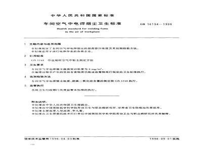 本标准规定了车间空气中电焊烟尘的最高容许浓度及其监测检验方法。本标准适用于进行电焊作业的各类企业。 GB 16194-1996 车间空气中电焊烟尘卫生标准 GB16194-1996 标准下载解压密码:www.bzxz.net
